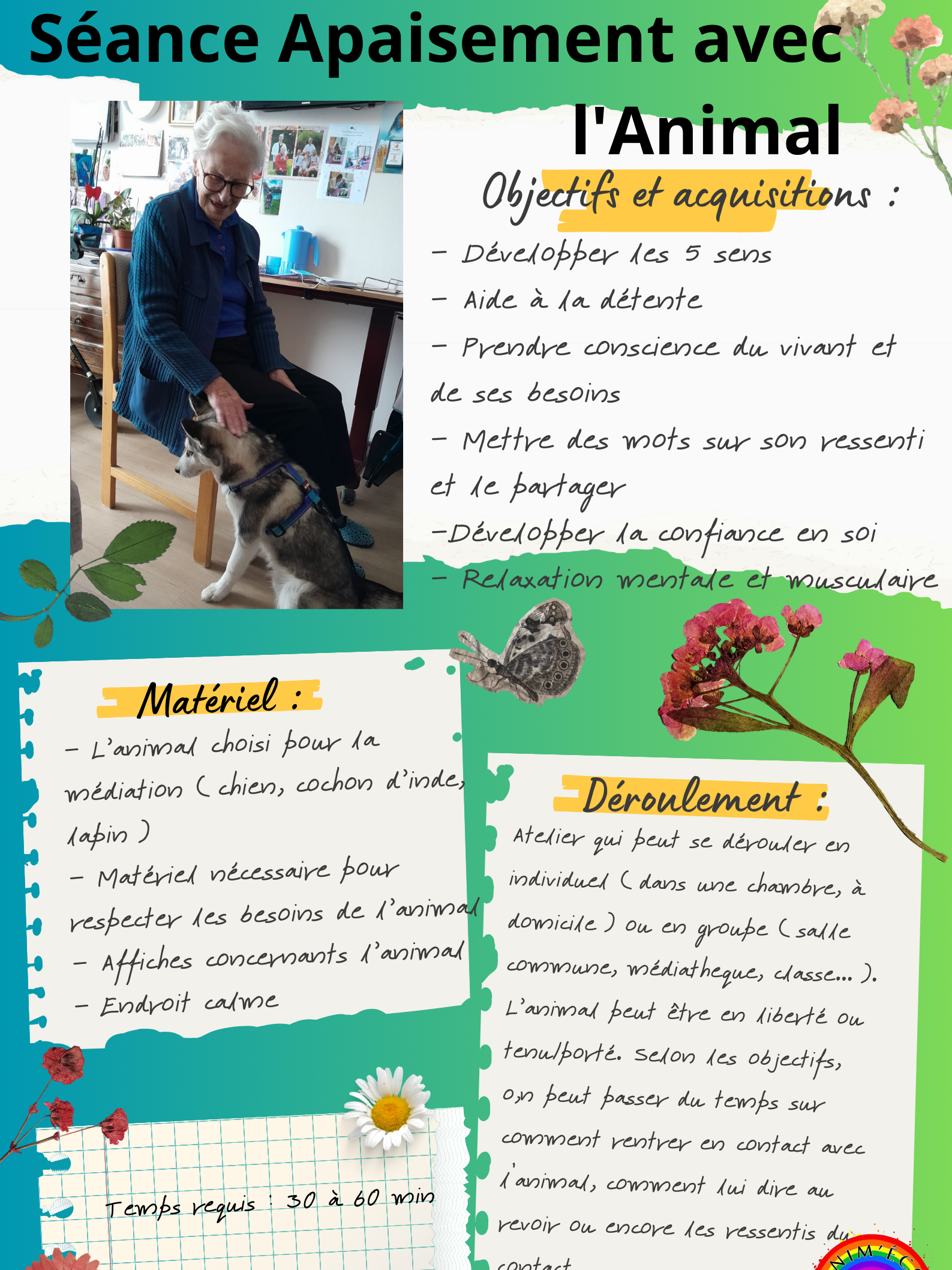Nous proposons des séances de médiation animale (nourrissage, prendre soin, observation, apaisement ou encore jeu), des séances PECCRAM (Programme d’Education à la Connaissance du Chien et au Risque D’accident par Morsure), des séances de LAC (Lecture avec le Chien) pour gagner en confiance grâce à la présence bienveillante du Chien. Deux cochons d’inde et un chien nous accompagnent dans ces ateliers.
